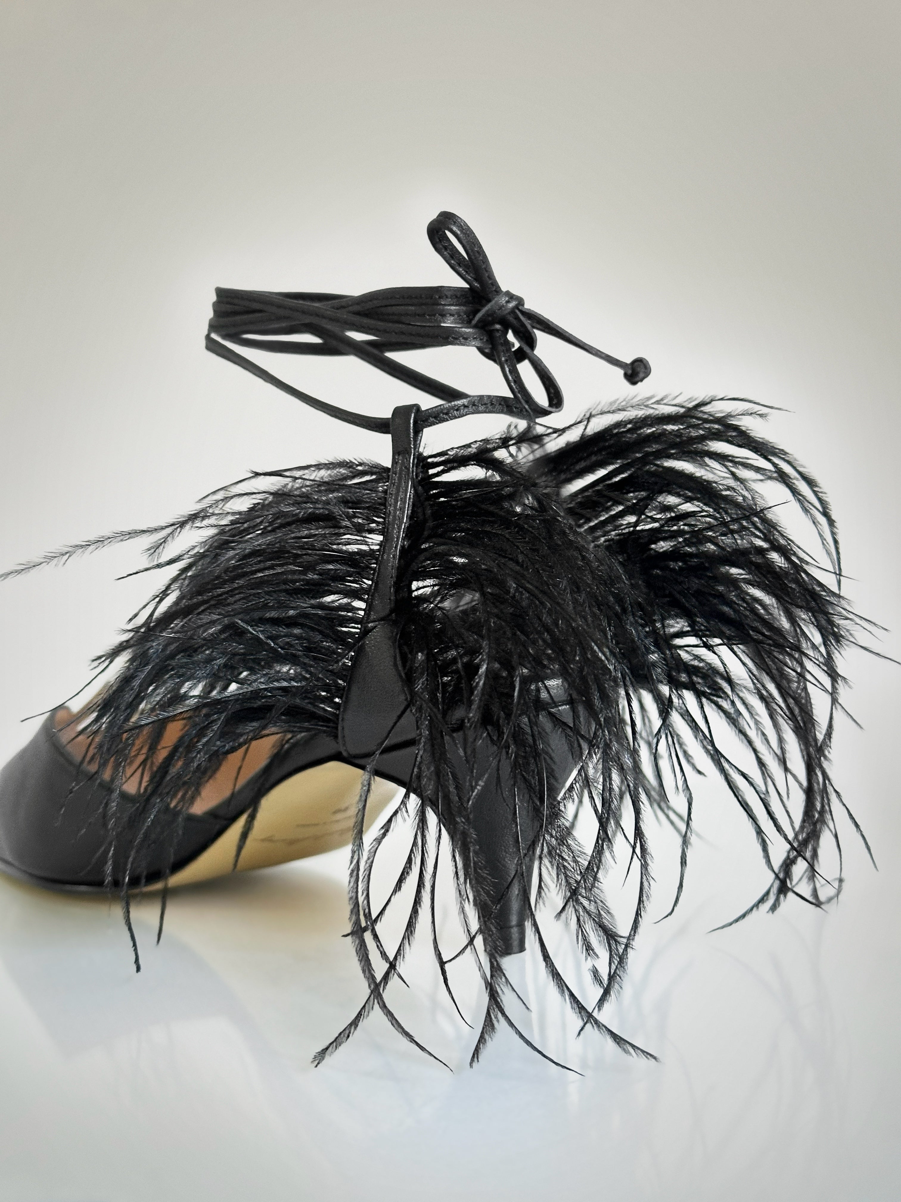 Pumps en cuero negro, sofisticados y ultra femeninos, con delicados lazos y plumas en el talón que aportan un aire sensual y elegante. Su tacón puntilla de 4,5 cm de altura los hace perfectos para llevar con estilo y comodidad, ideales para elevar cualquier look con un toque de glamour y distinción
