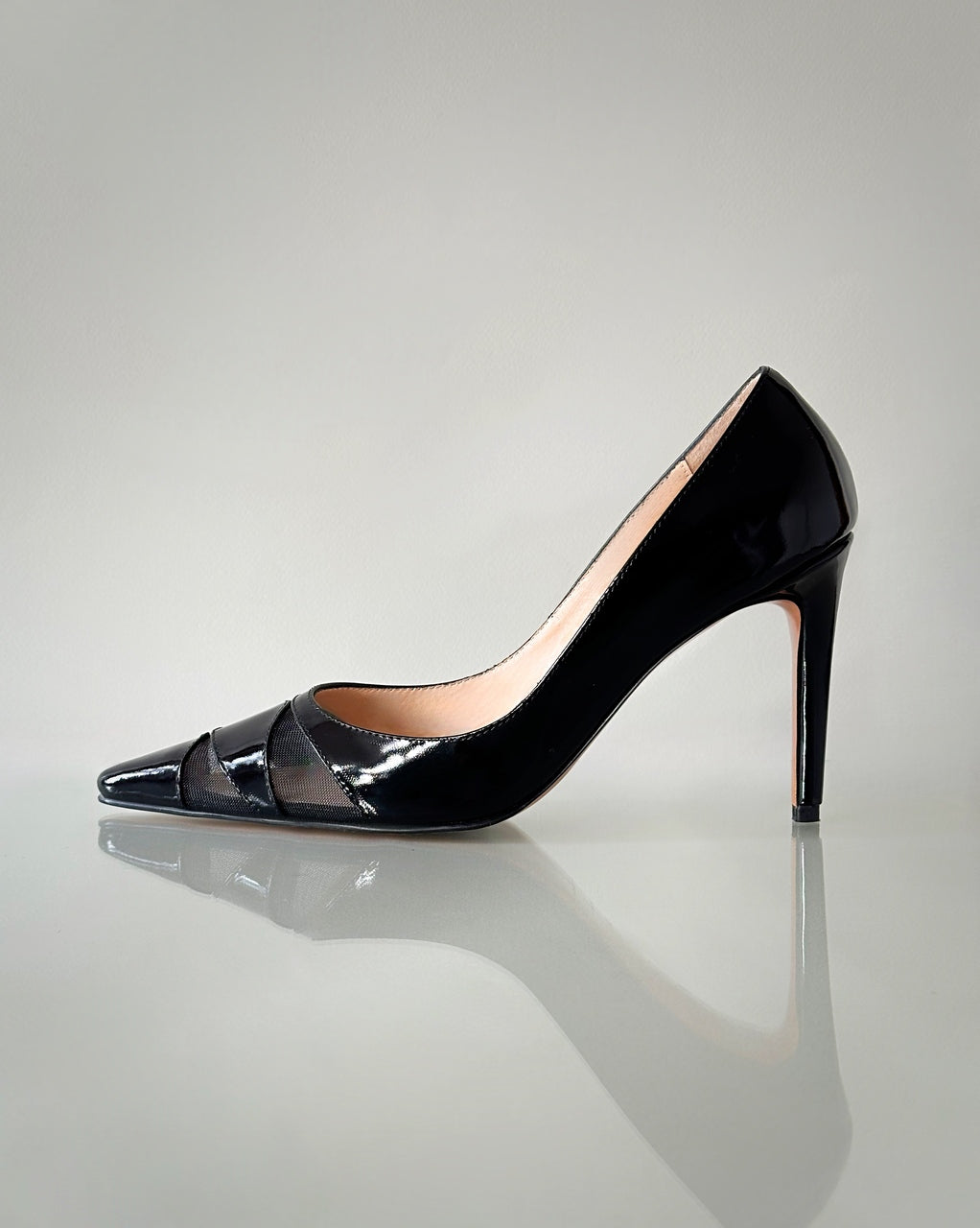 Zapatos de salón en charol, cuero y malla negra con tacón de 8.5 cm – contraste sofisticado y elegancia moderna.