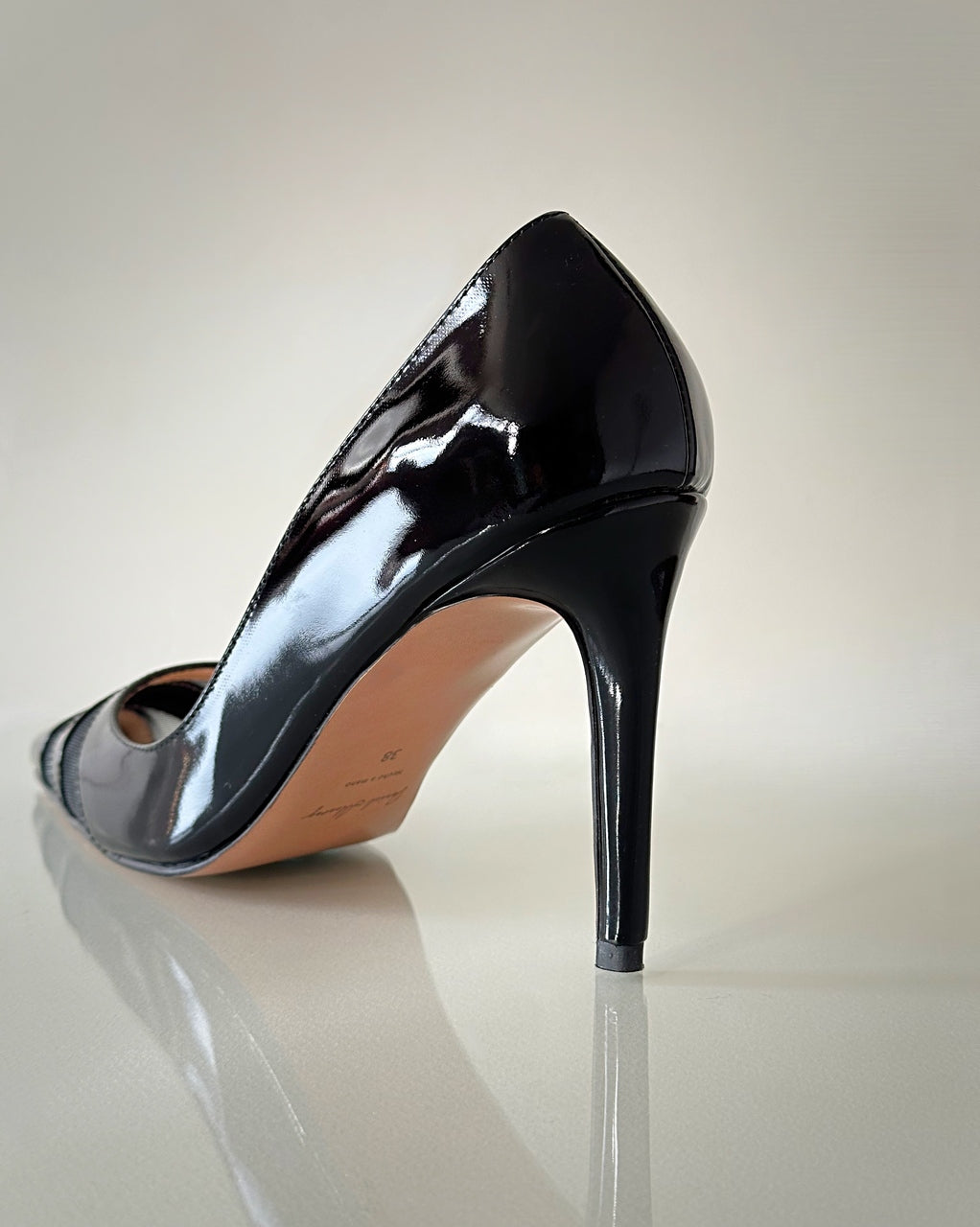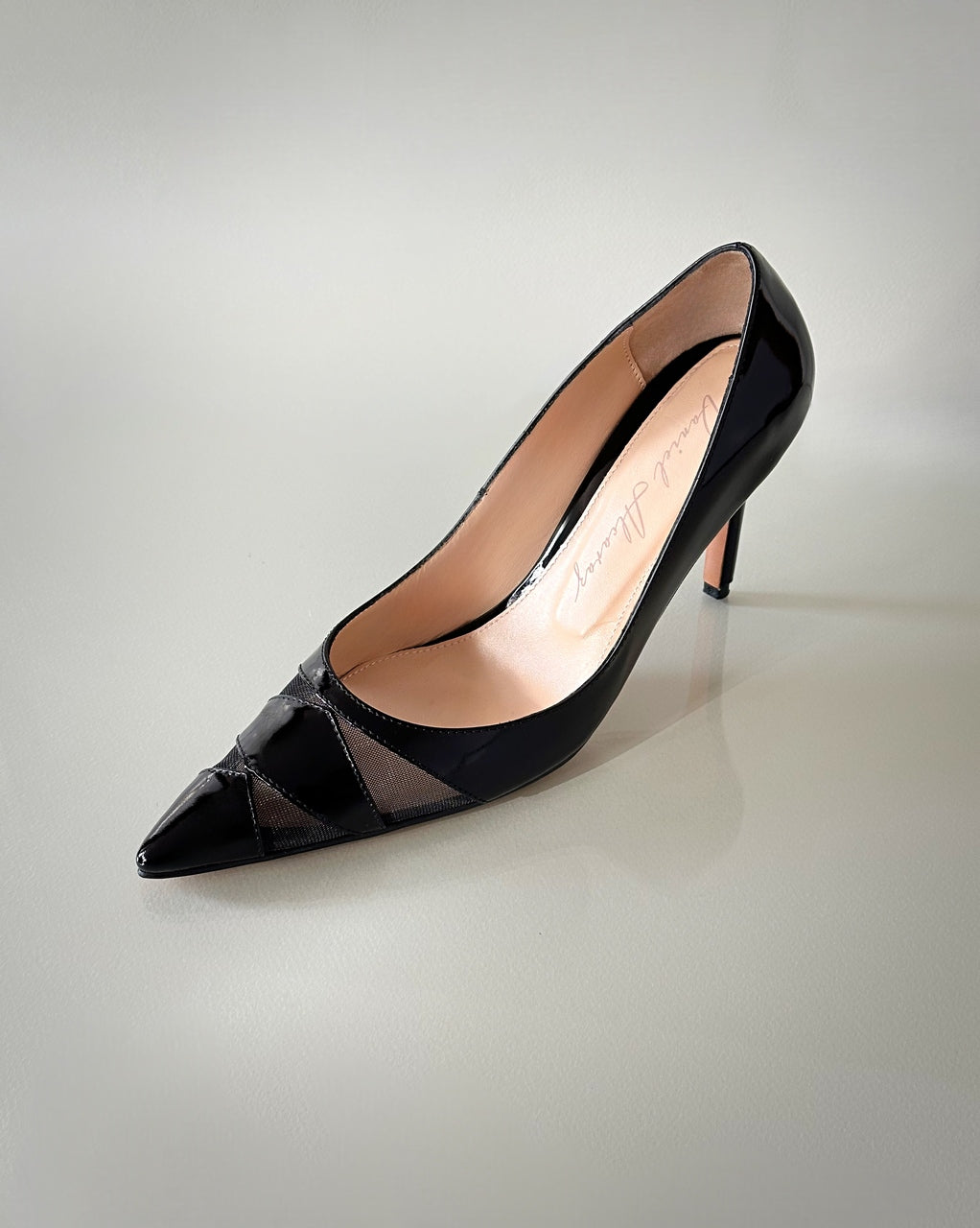 Estos zapatos de salón combinan charol, cuero y malla negra, creando un diseño contemporáneo que mezcla brillo, textura y ligereza visual. El tacón de 8.5 cm estiliza la silueta y aporta una presencia femenina y refinada, ideal para ocasiones especiales o looks nocturnos.